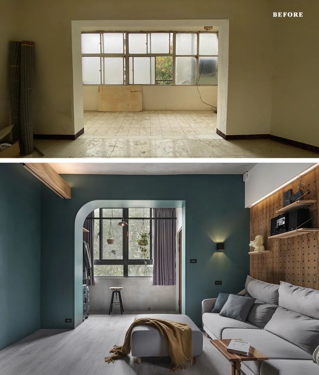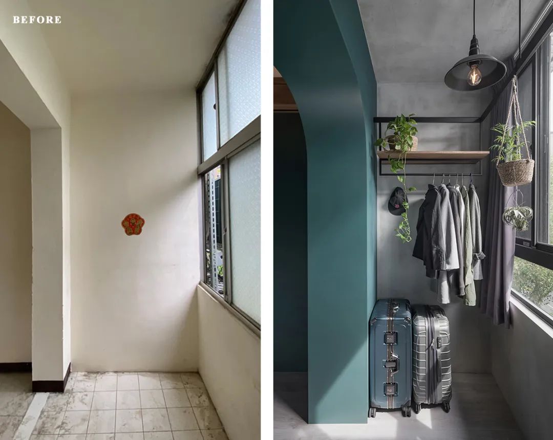 改造后的玄關,用圓弧型埡口消融生硬感,墨綠色+水泥原色的搭配,仿佛回歸自然,與窗邊隨風搖曳的婆娑枝葉,相映成趣。