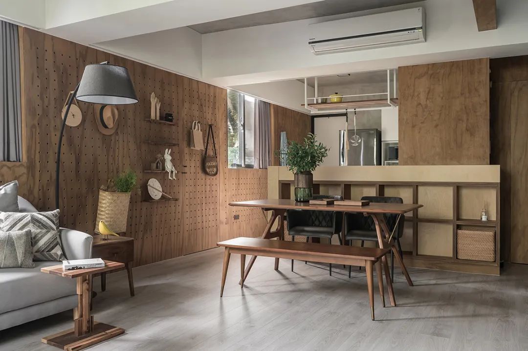 沙發(fā)背景墻用全墻洞洞板,可以隔絕室外的潮氣,還能增加收納。