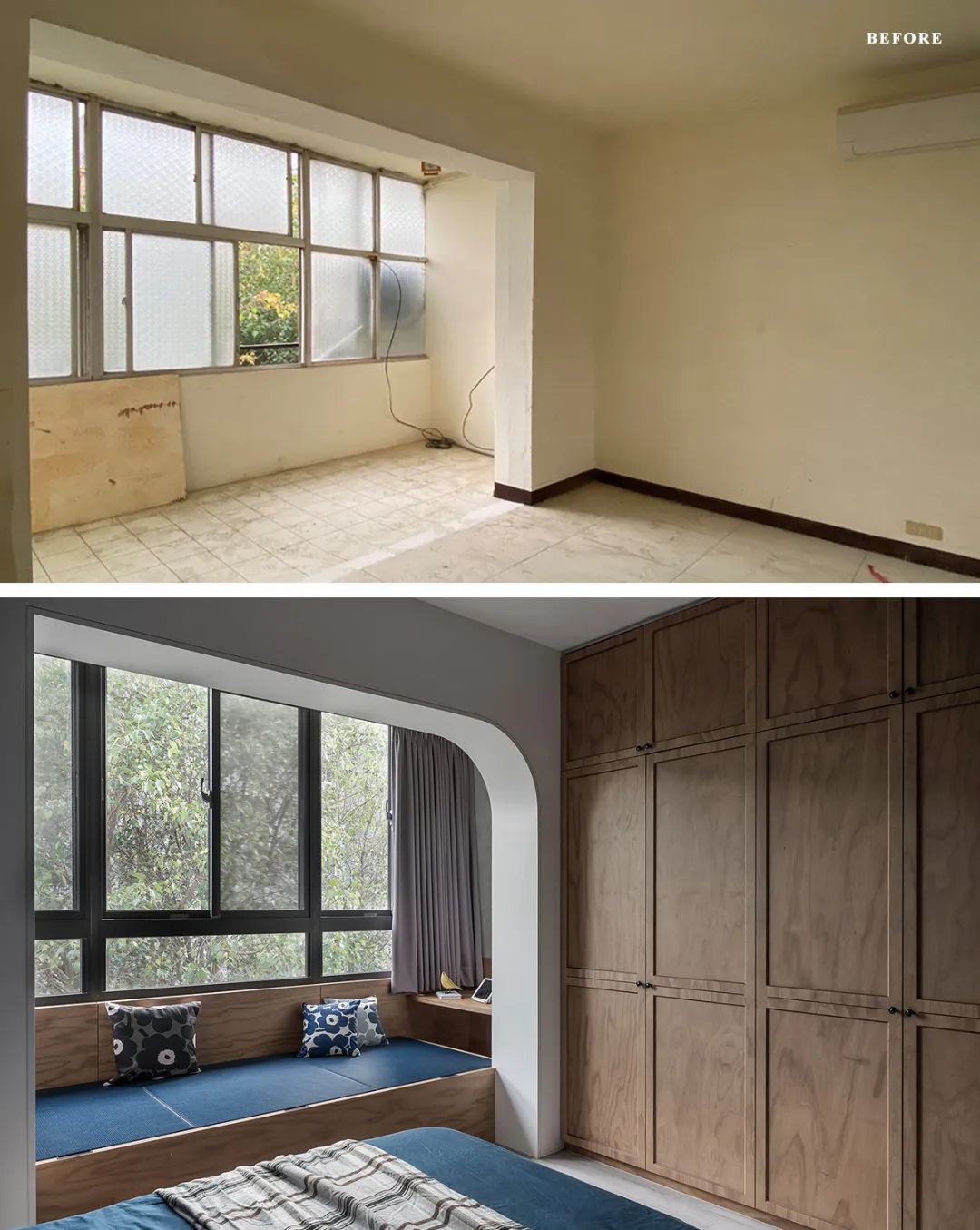 主臥用隱藏門,陽臺埡口同樣用弧形削弱銳化感。