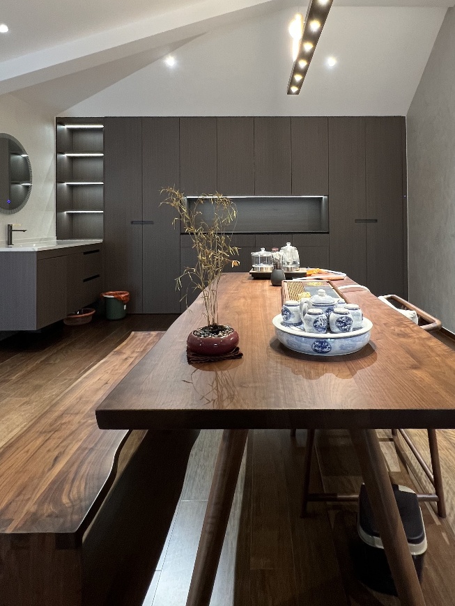 胡桃木茶桌選了獨特造型,弱化斜頂?shù)谋曝聘?,反而因不?guī)則線條,多了份隨性的雅趣。搭配枯竹盆景、青花茶器,傳統(tǒng)元素與現(xiàn)代空間碰撞,連斜頂下的光影都成了天然的氛圍組,午后陽光斜照,茶香與木香交融,這才是中式美學的 “藏與顯”。