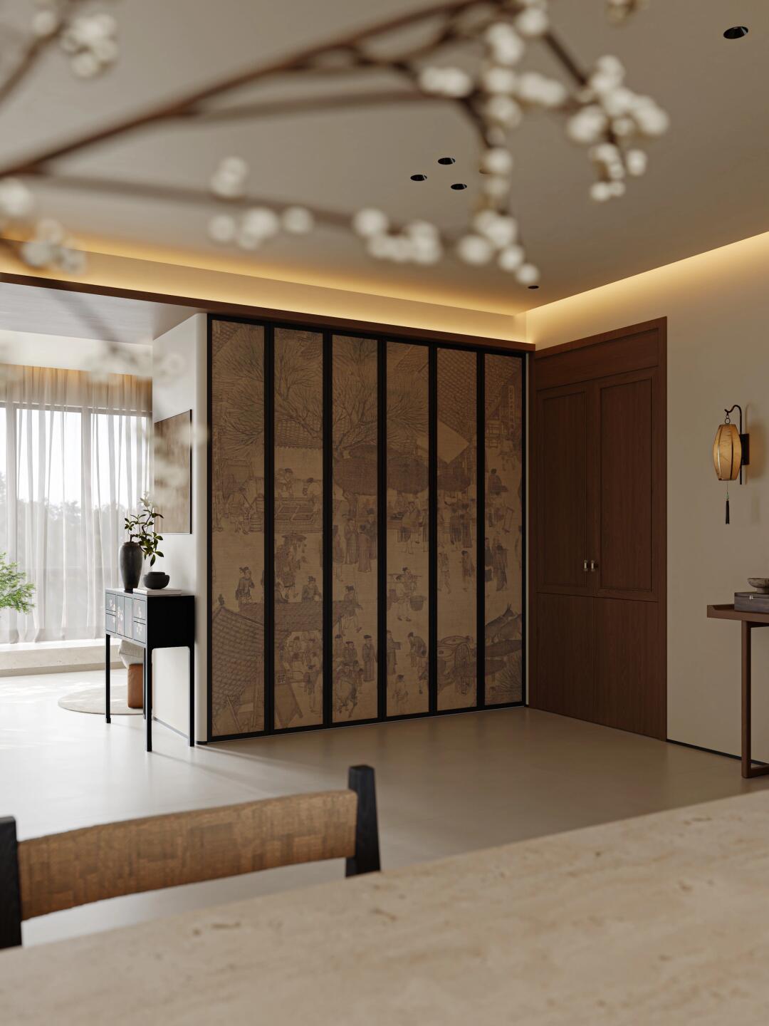 本案完美詮釋宋氏美學(xué),將其雅致與詩(shī)意融入現(xiàn)代家居。色調(diào)選取溫潤(rùn)的原木色與柔和的米白色為主調(diào),搭配和諧,營(yíng)造出寧?kù)o、舒緩且極具質(zhì)感的空間氛圍,仿若能讓人卸下塵世喧囂。
