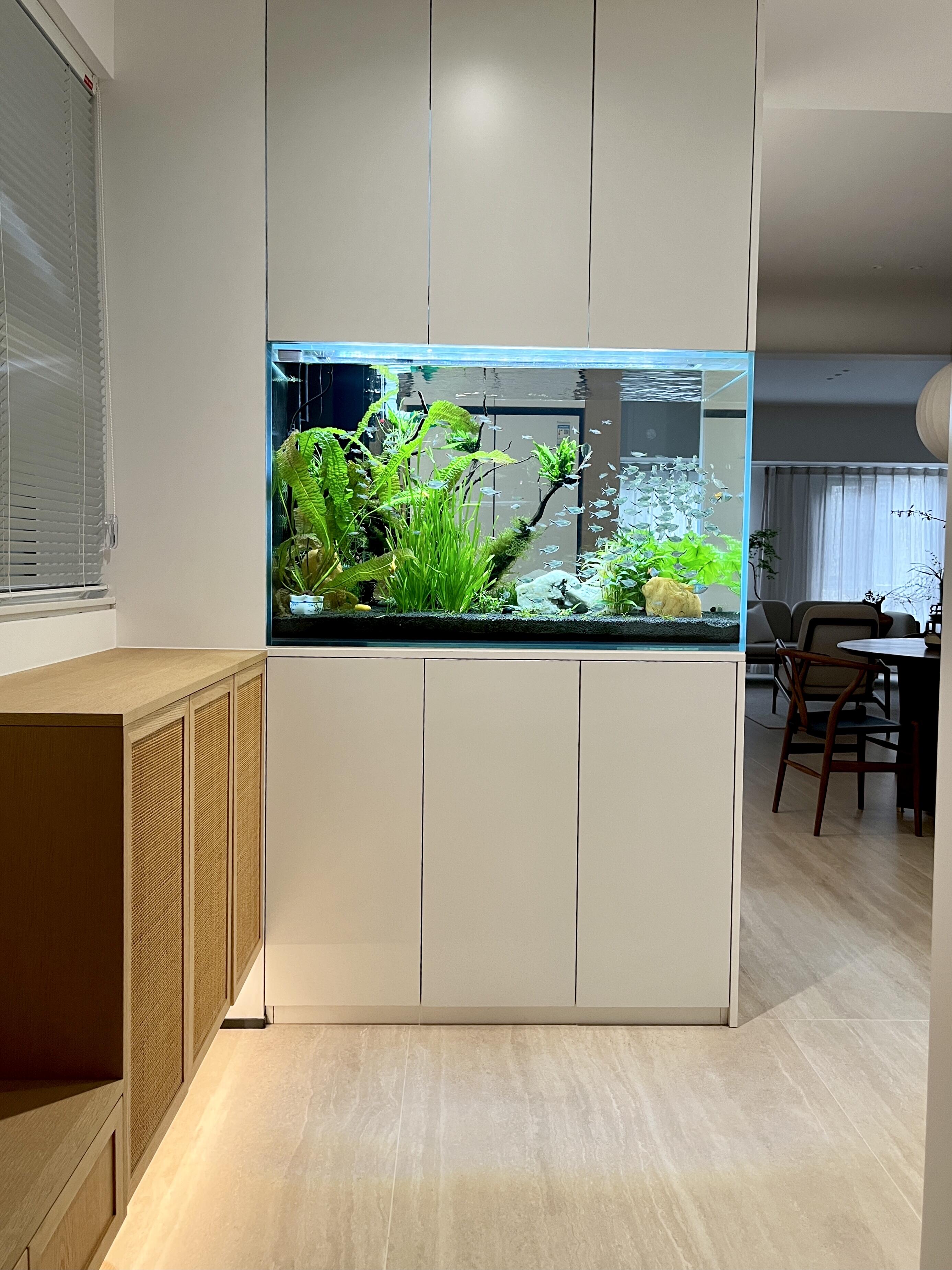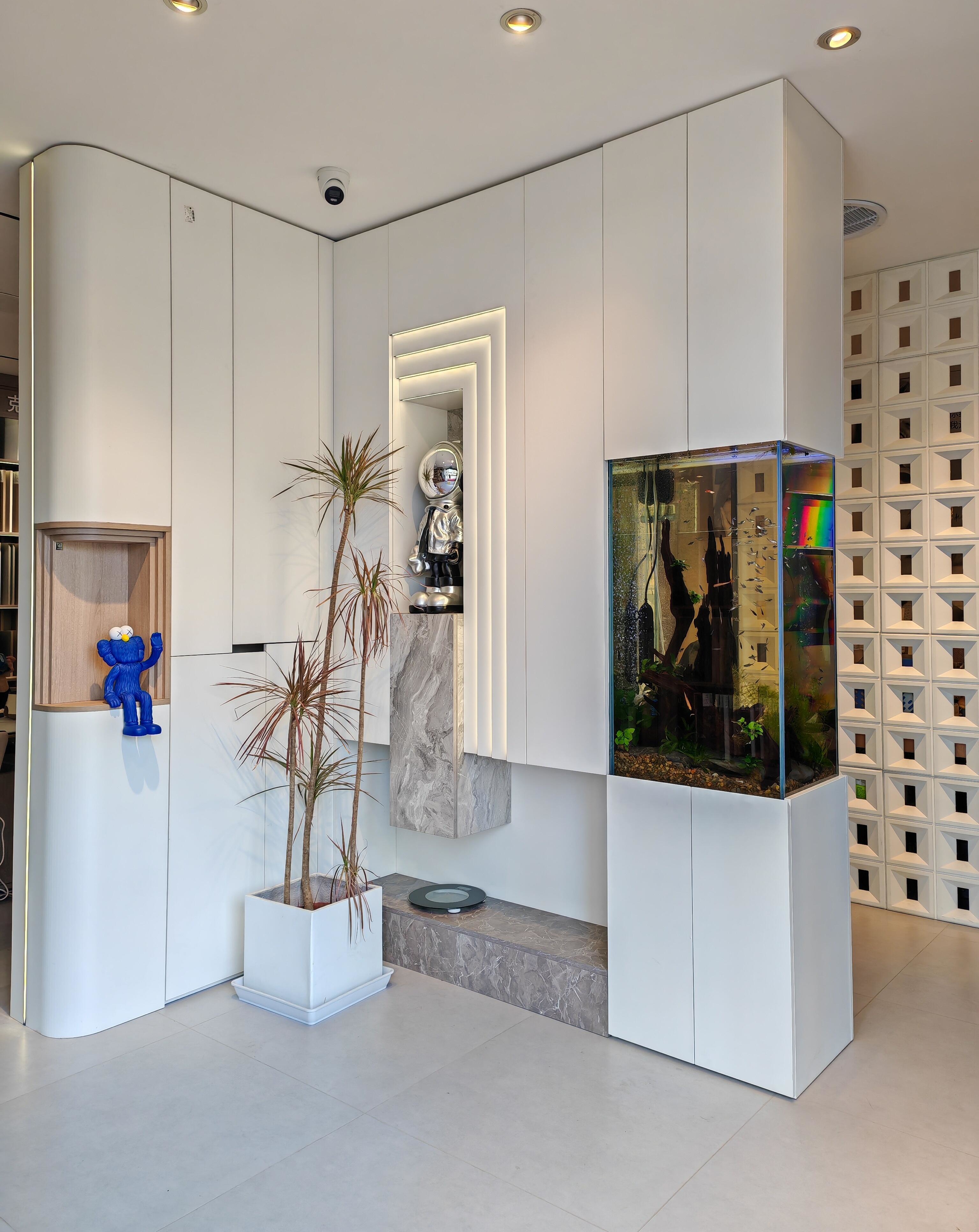 現(xiàn)代簡約風(fēng)里,與簡潔柜體結(jié)合,以干凈線條、素雅色調(diào),讓魚缸成為空間自然延伸;
