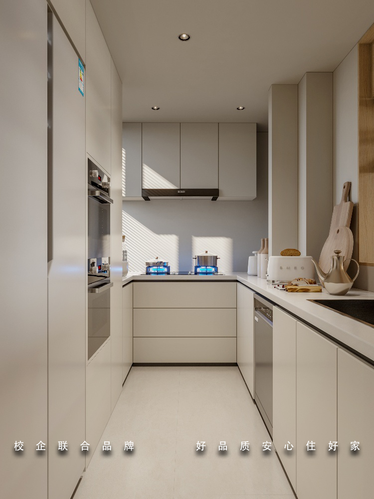 空間利用方面頗為用心,采用開放式或半開放式的布局思路,使各功能區(qū)既相對(duì)獨(dú)立又能相互聯(lián)動(dòng),減少了空間的割裂感。廚房的 U 型布局,合理分配操作區(qū)域,提升了使用效率;