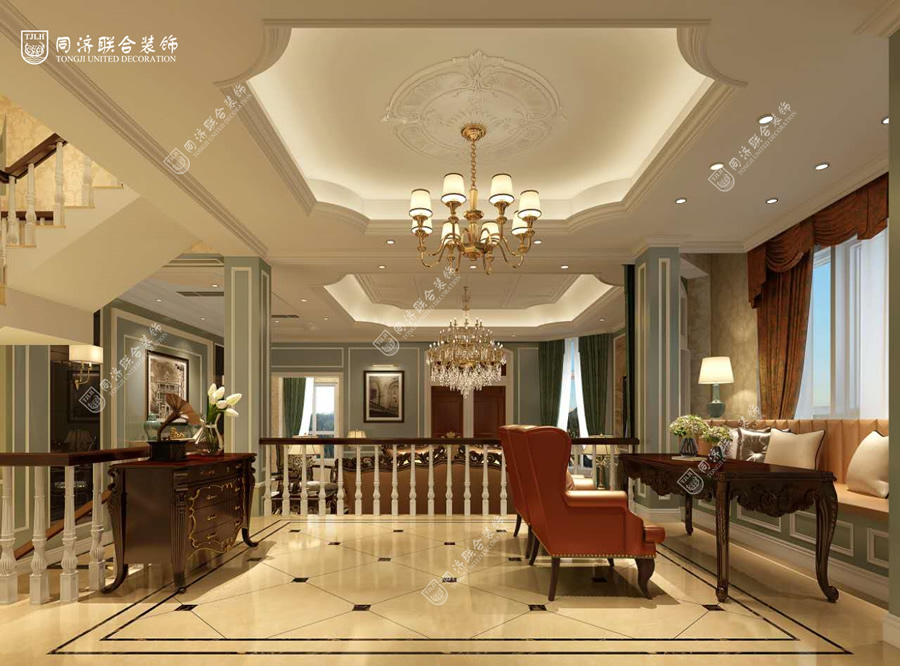 本案在延續(xù)歐式雅致大氣的同時(shí)又融入現(xiàn)代簡(jiǎn)約時(shí)尚的元素,力求將空間打造成既富有藝術(shù)氣息又優(yōu)雅華貴的新古典居所。整個(gè)大廳通透明亮,雍容考究的仿古磚與墻體線條簡(jiǎn)練硬朗,給空間以無(wú)限的張力?;宜{(lán)色窗簾的使用更是給人無(wú)盡的夢(mèng)幻之感,從色彩角度詮釋了空間的跳躍與漸變,無(wú)形中給居家增添了幾分神秘與浪漫。置身其中,讓人心生無(wú)盡的愛(ài)戀與歡愉
