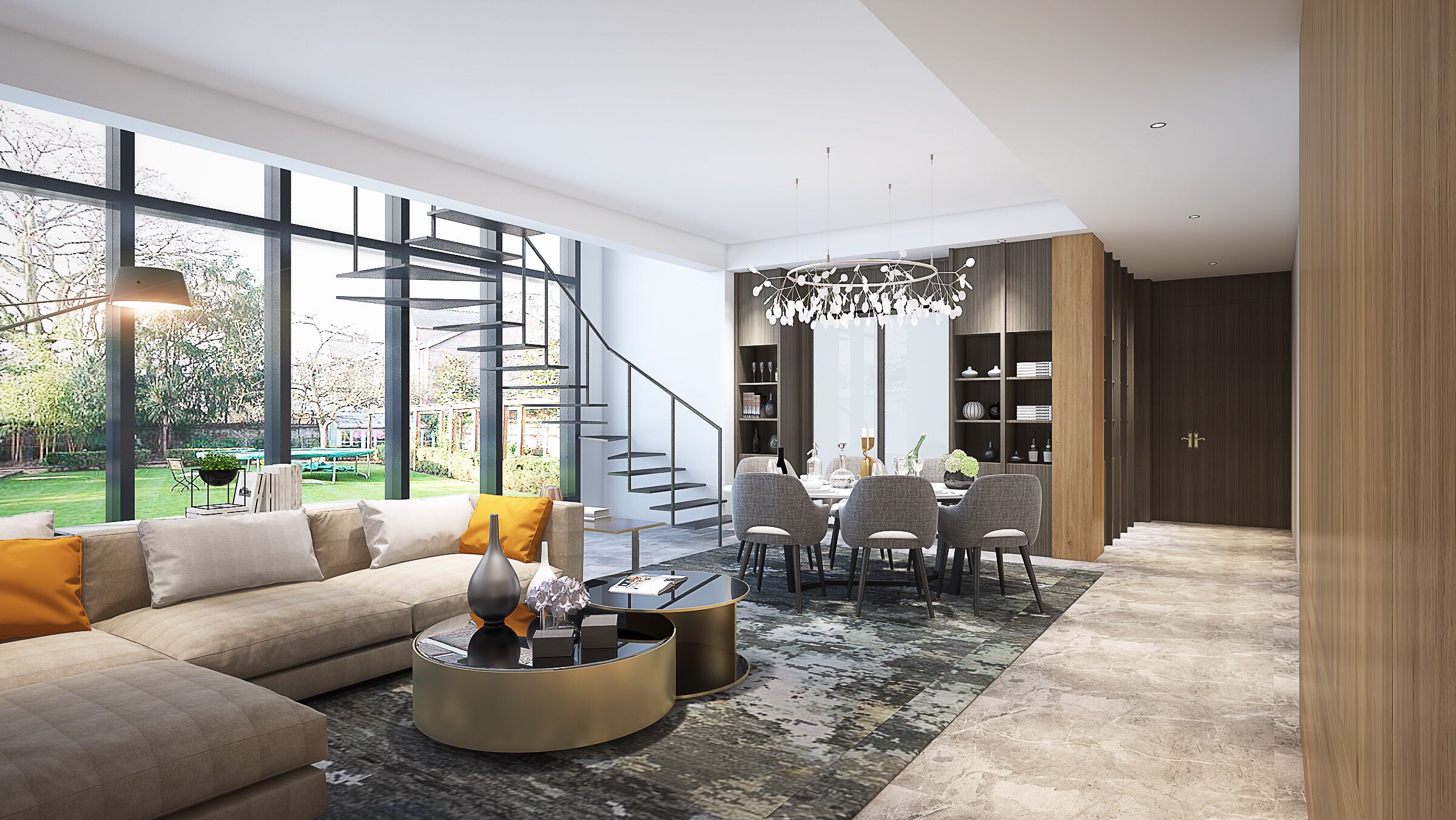 如果兩個(gè)門的距離遠(yuǎn),空間允許的話可以放置屏風(fēng),轉(zhuǎn)化場(chǎng)態(tài)。