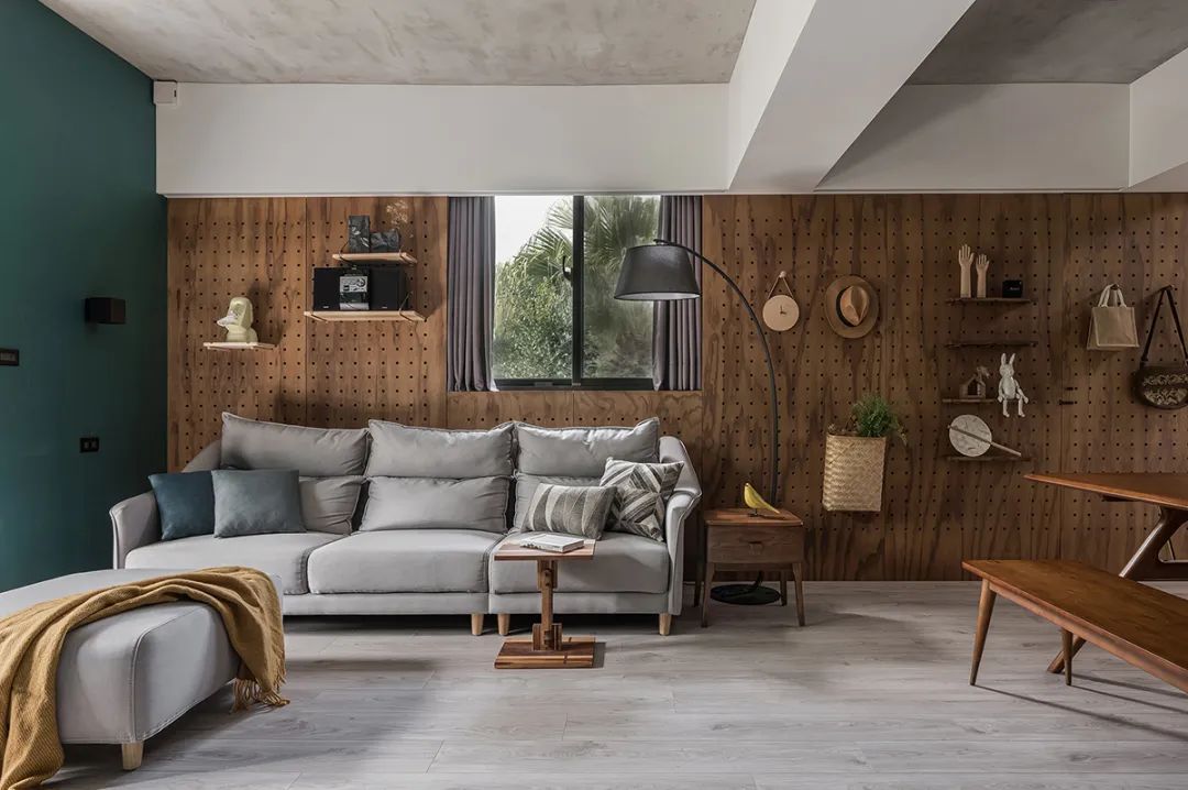 沙發(fā)背景墻用全墻洞洞板,可以隔絕室外的潮氣,還能增加收納。