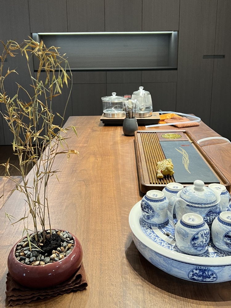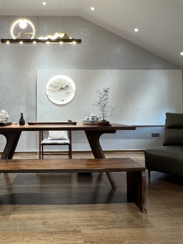 胡桃木茶桌選了獨特造型,弱化斜頂?shù)谋曝聘?,反而因不?guī)則線條,多了份隨性的雅趣。搭配枯竹盆景、青花茶器,傳統(tǒng)元素與現(xiàn)代空間碰撞,連斜頂下的光影都成了天然的氛圍組,午后陽光斜照,茶香與木香交融,這才是中式美學的 “藏與顯”。