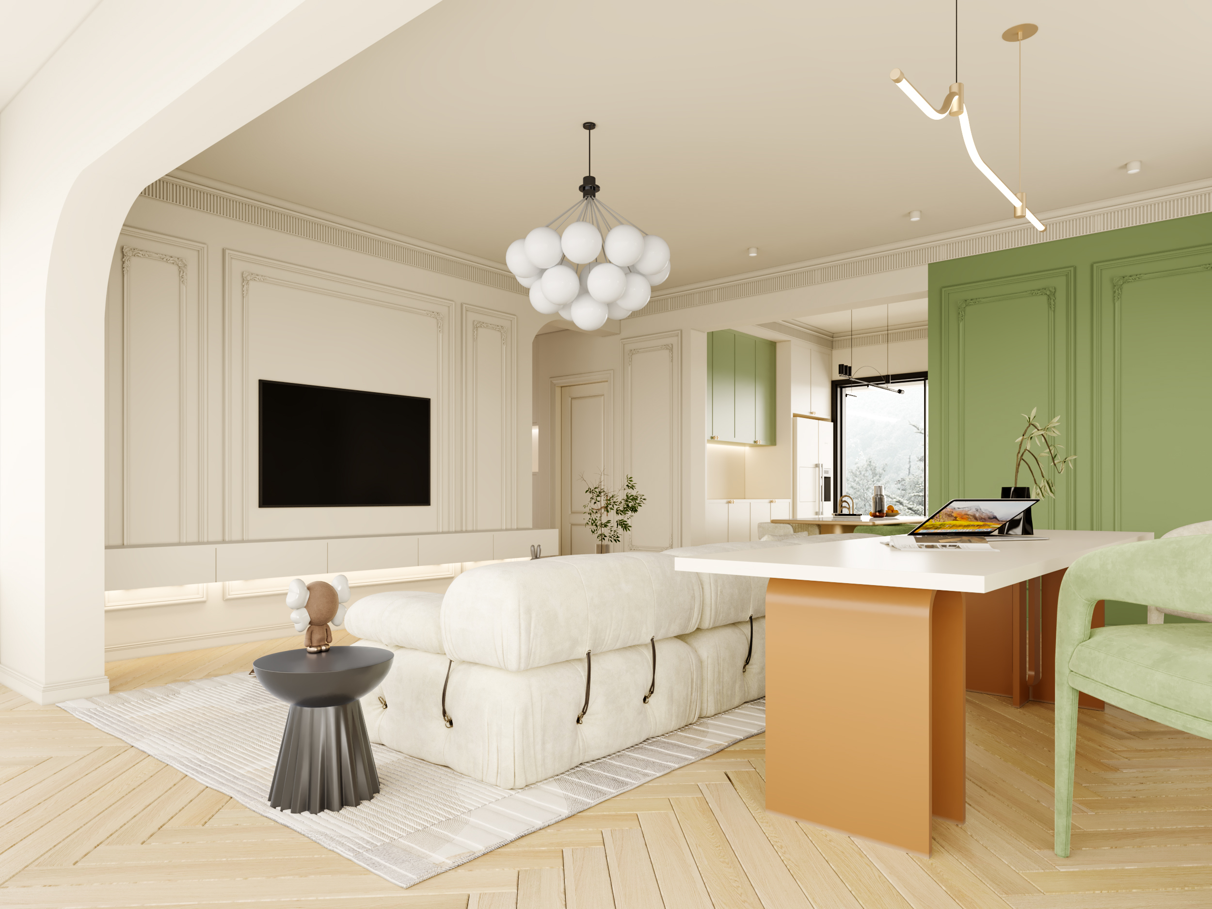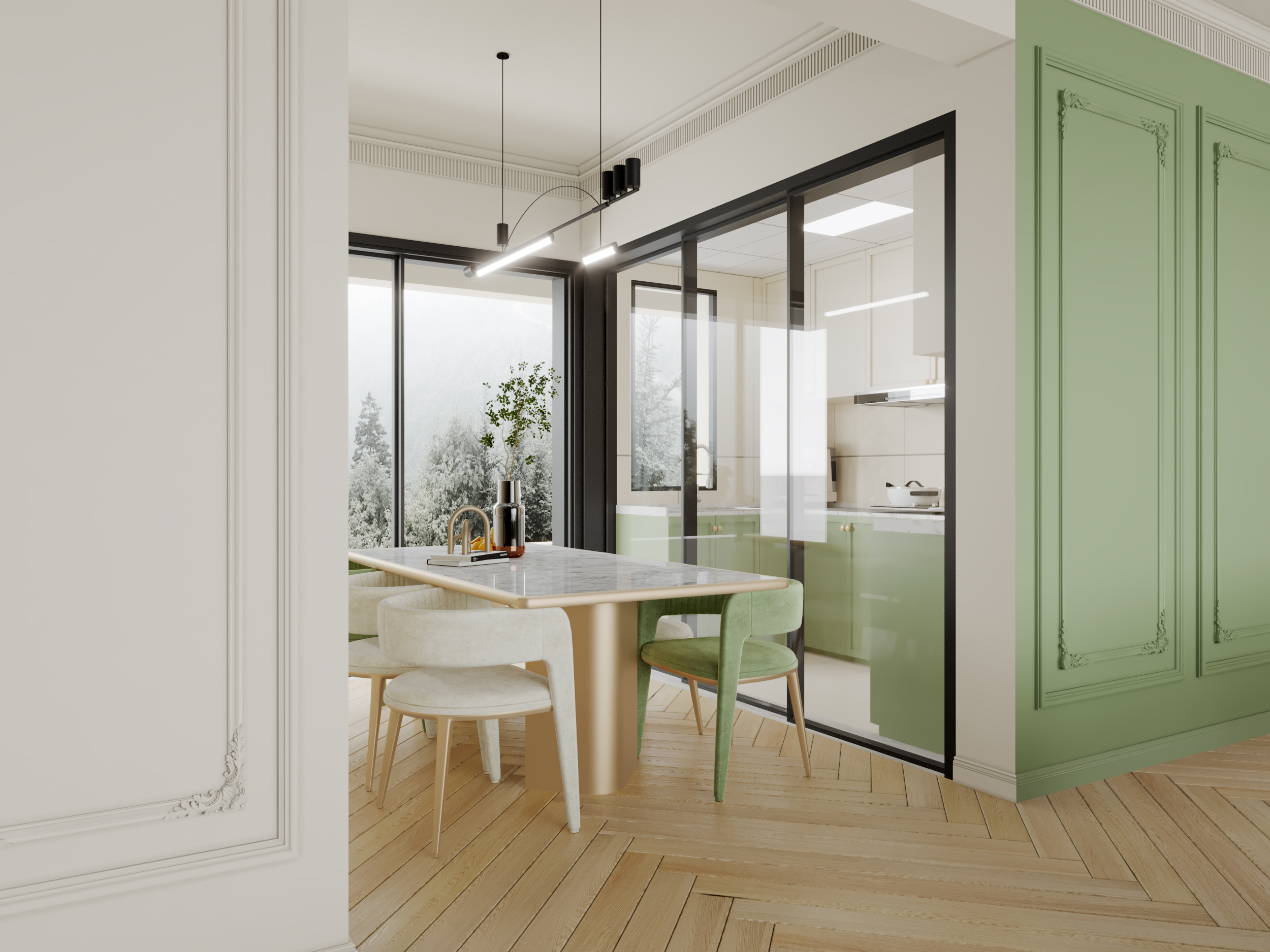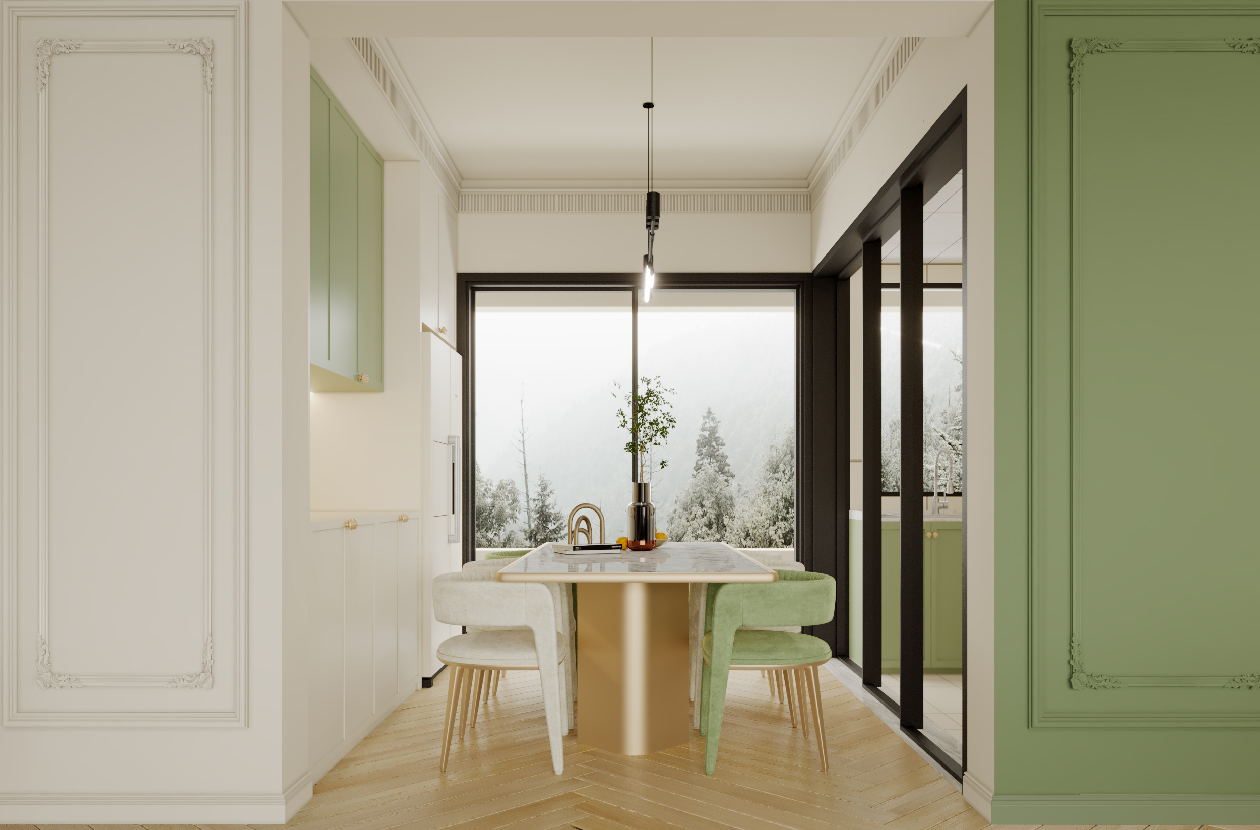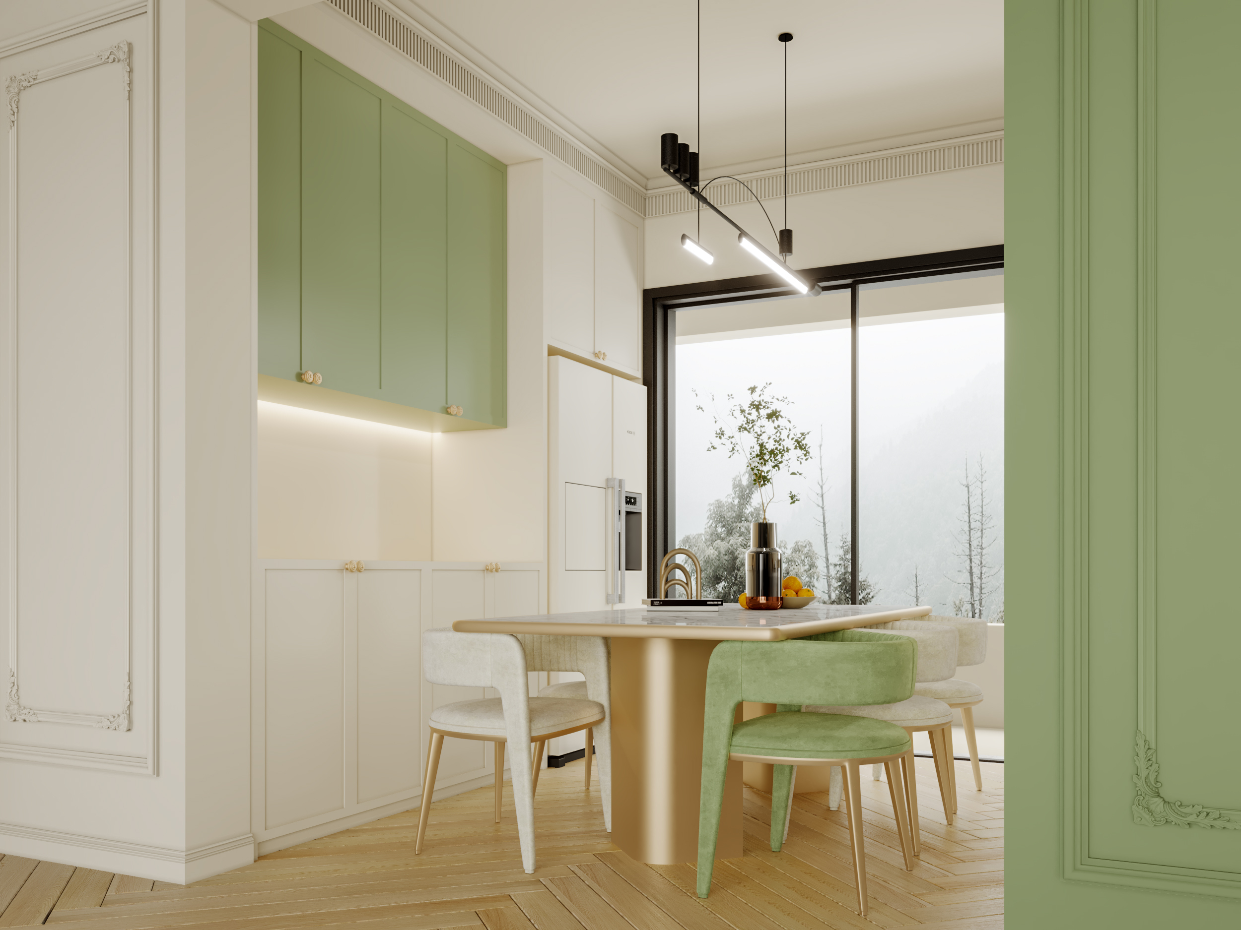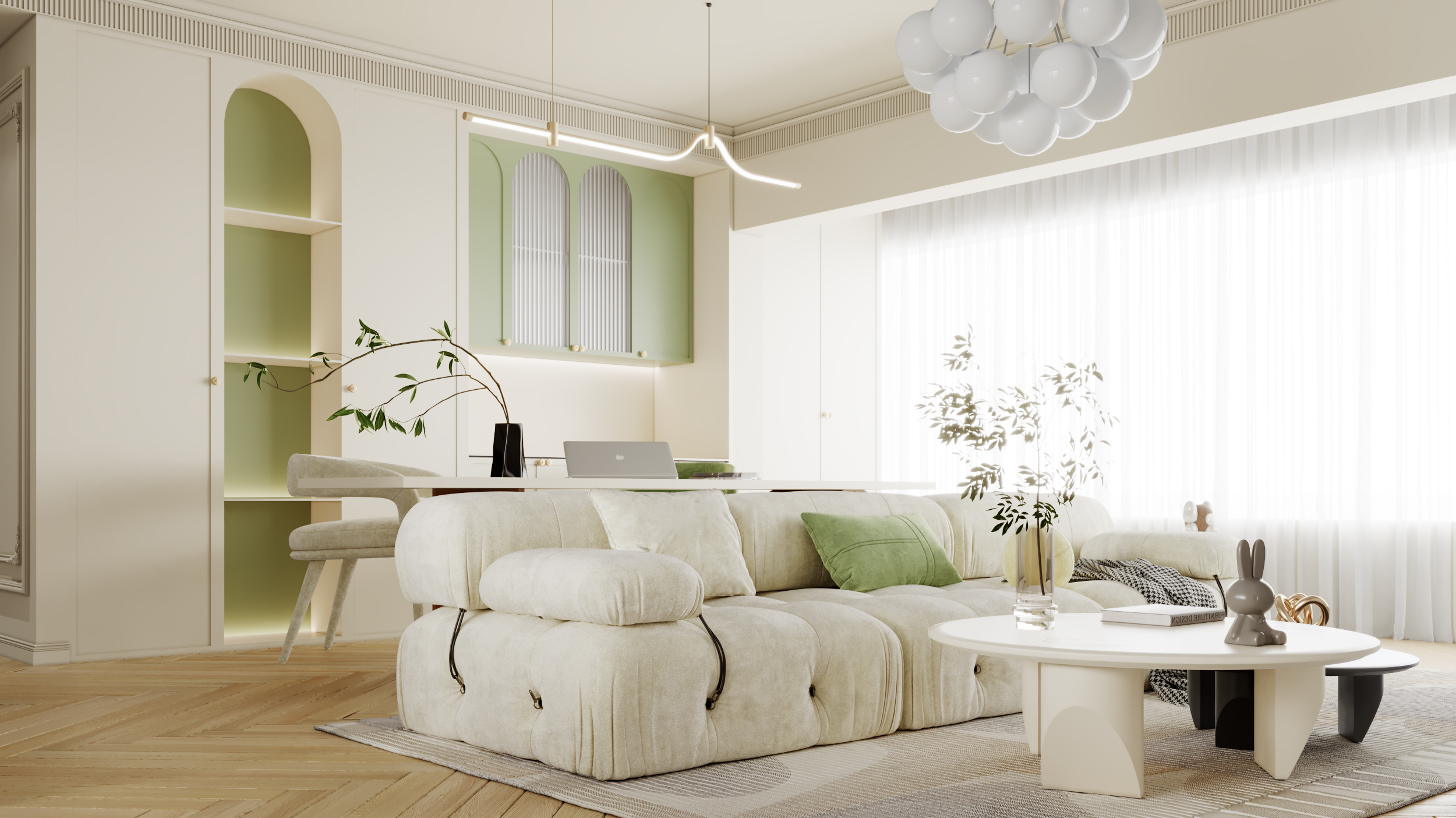 色調(diào)上,以柔和的奶油白為基底,搭配清新的薄荷綠,仿若把春日花園搬進(jìn)了室內(nèi),營造出溫柔又充滿生機(jī)的氛圍。