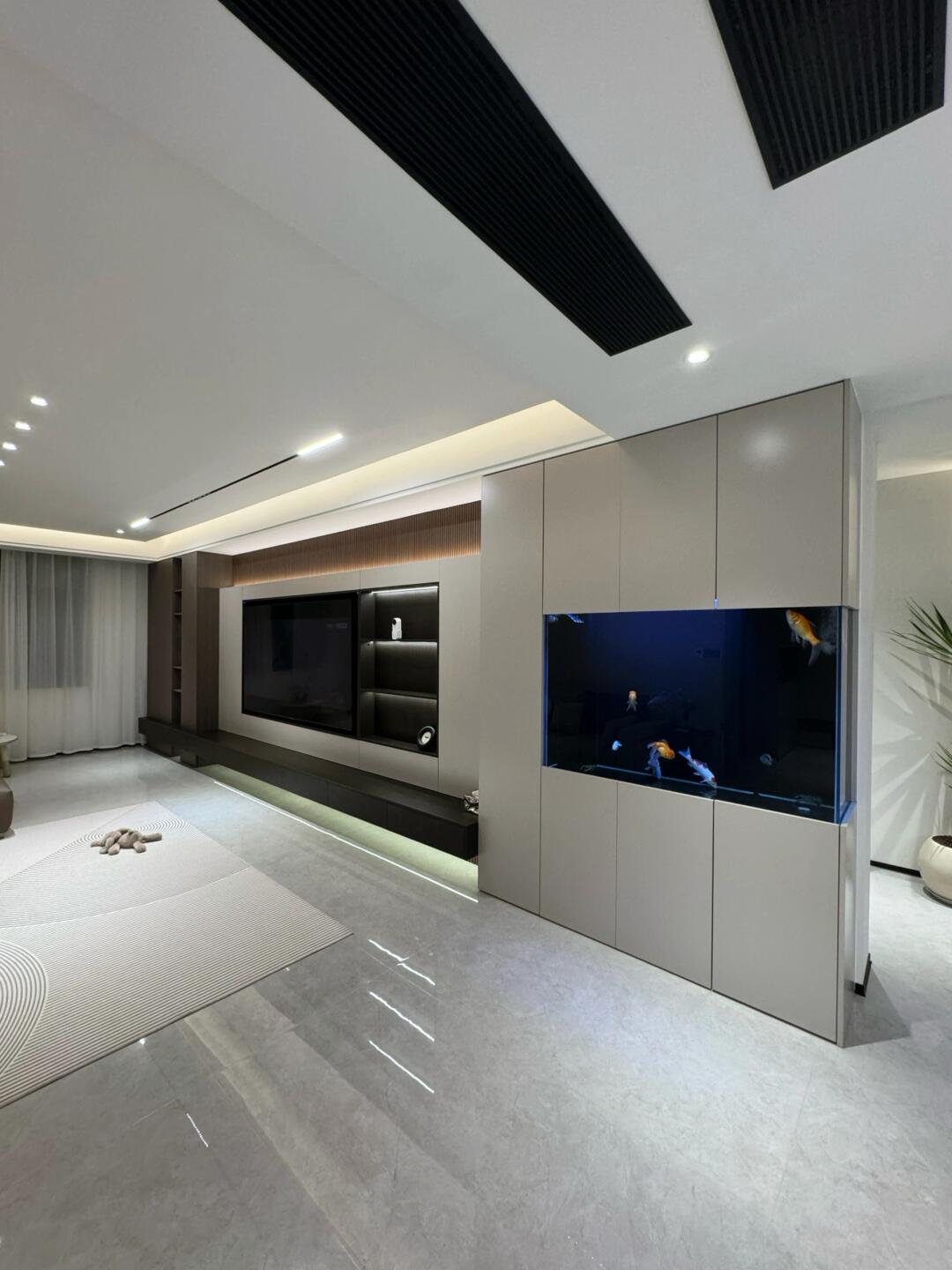 現(xiàn)代簡約風(fēng)里,與簡潔柜體結(jié)合,以干凈線條、素雅色調(diào),讓魚缸成為空間自然延伸;