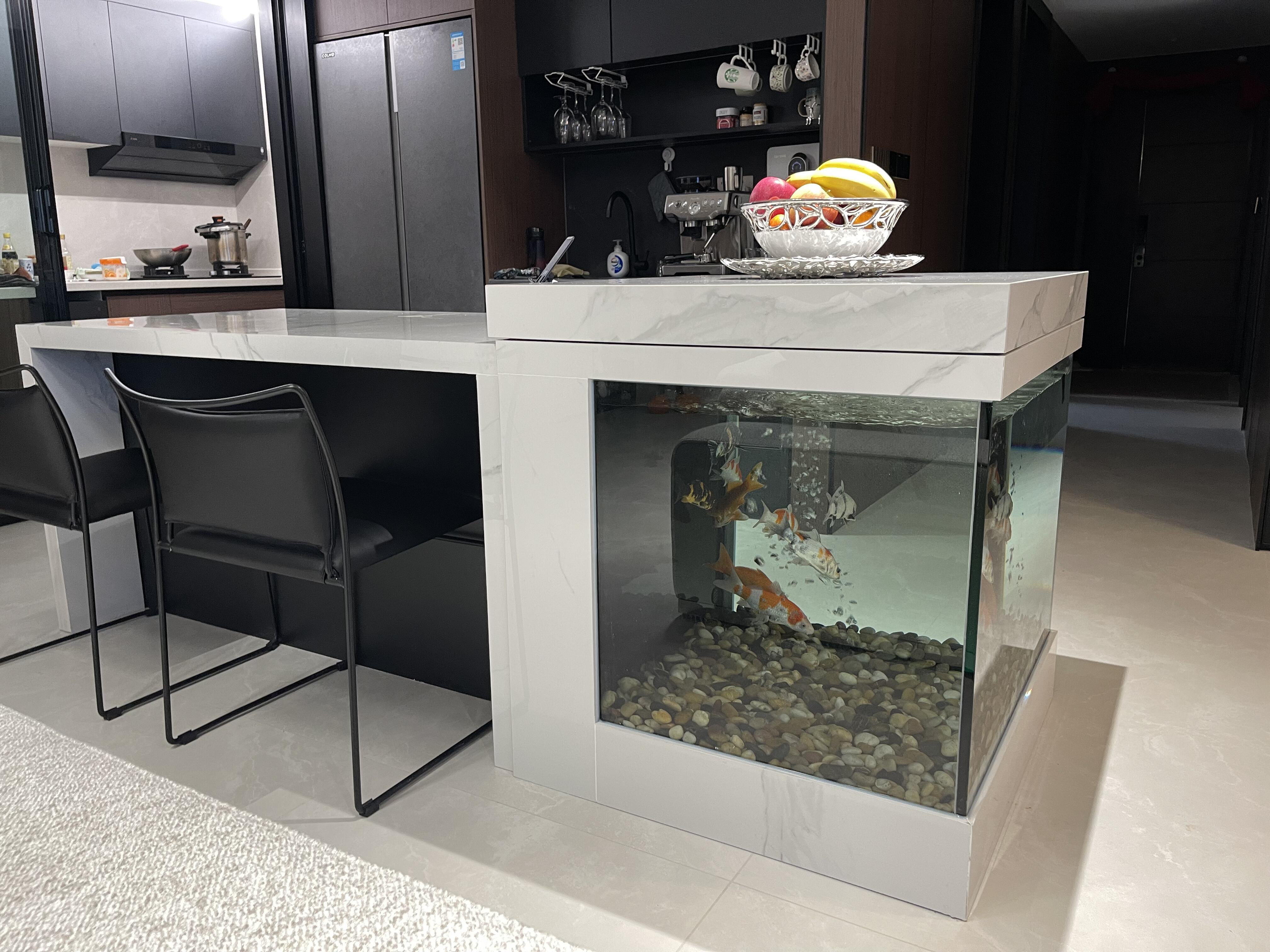 在設(shè)計(jì)上,它高效利用墻體或柜體空間,解決傳統(tǒng)魚缸占獨(dú)立空間的問題。且嵌入式結(jié)構(gòu)使其成為視覺焦點(diǎn),水中游魚與造景呼應(yīng),為空間注入自然生機(jī),無論是客廳作為藝術(shù)點(diǎn)綴,還是廚房增添生活意趣,都能打破水族與空間的邊界,讓水族藝術(shù)深度融入空間肌理,為居住者打造獨(dú)特且富有生機(jī)的居住體驗(yàn)。